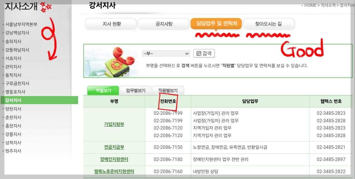 위 사진처럼 담당업무 별로 담당부서 전화번호와 팩스번호 뿐만 아니라 '찾아오시는 길'도 쉽게 안내되어 있으니 '국민연금 공단 전국 지사'를 한눈에 보고 싶으신 분들은 [ NPS 국민연금 홈페이지 - 지사소개 ] 메뉴를 이용해보시기 바랍니다.