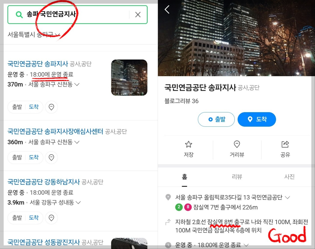 즉, 국민연금공단 지사찾기는 [네이버지도 페이지]를 이용하는 것이 가장 쉽다는 말씀입니다! 운영시간 뿐만 아니라 자세한 위치도 친절하게 설명되어 있습니다.