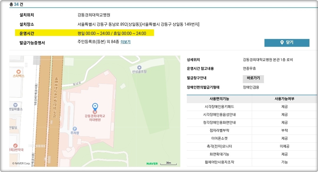 먼저 규모가 큰 병원답게 강동경희대학교병원, 중앙보훈병원, 강동성심병원은 평일이든 주말이든 상관없이 24시간 무인민원발급기를 이용할 수 있었습니다.