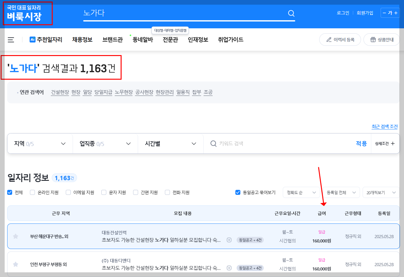 “초보자도 가능한 노가다 알바” 같은 문구가 많이 보이는 걸 보면, 아직 현장 경험이 부족한 분들도 부담 없이 시작할 수 있다는 점에서 장점이에요. - 전국 단위+지역 필터링 강력