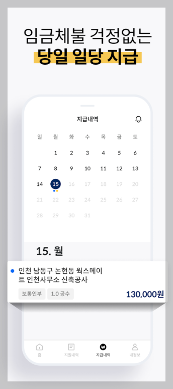 등록된 일자리들이 검증된 업체 중심이고, 장기공사 포함 다양한 직종이 꾸준히 올라오고 있어서 지속적으로 현장 나가기를 원하는 분들에게도 잘 맞습니다. - 당일 일당 지급 시스템