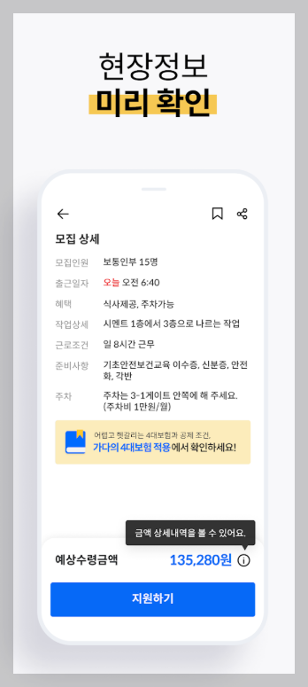 근무지 도착 전에 근무시간, 단가, 현장 위치, 준비물까지 미리 확인할 수 있으니, 초보자라도 당황하지 않고 준비해서 출근할 수 있습니다.
