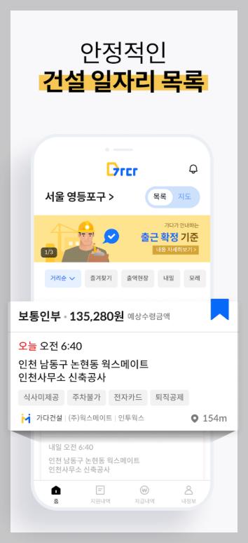 이미지에서 보이듯, 전날 밤이나 아침에 앱을 통해 지원하고 매칭만 되면 인력사무소 대기 없이 바로 현장으로 출근할 수 있습니다. 현장까지 가는 지도도 연동되어 있어 이동도 편리하죠. - 안정적인 건설일자리 리스트