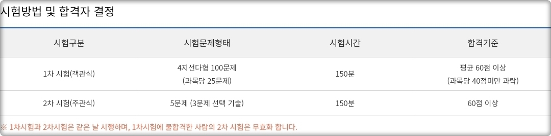 시험은 1차 객관식, 2차 주관식으로 나뉘며, 같은 날에 순차적으로 시행됩니다.