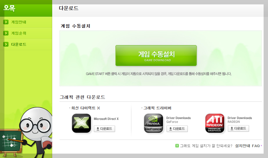 - 자동설치가 안될 때는 ‘게임 수동설치’라는 녹색 버튼이 크게 보이실 텐데요,