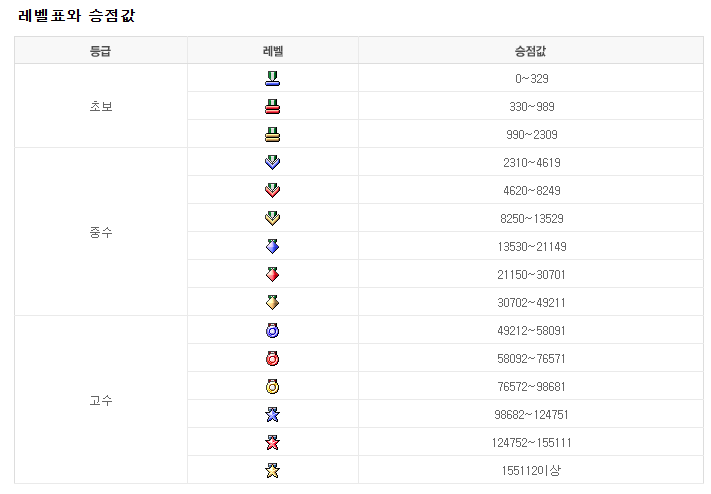 이 승점에 따라 ‘초보-중수-고수’ 등급으로 나뉘고, 그 안에서도 세부 단계별로 아이콘이 표시됩니다.
