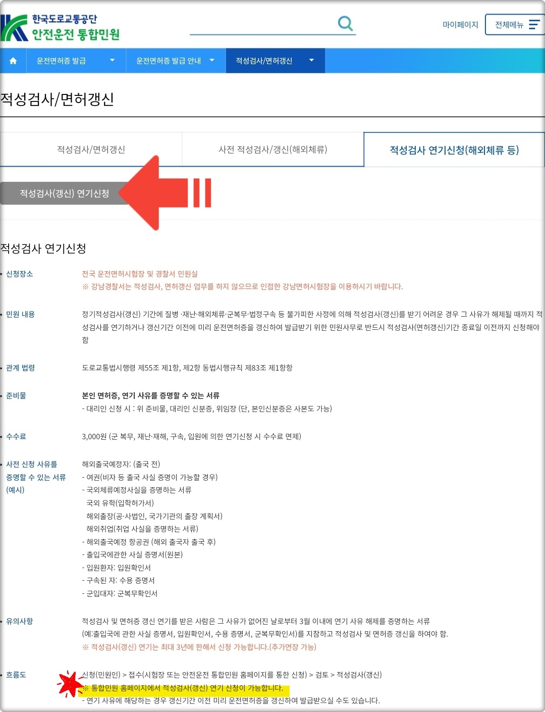 다만, 연기신청은 반드시 적성검사(면허갱신) 기간이 끝나기 전에 해야 한다는 점입니다.