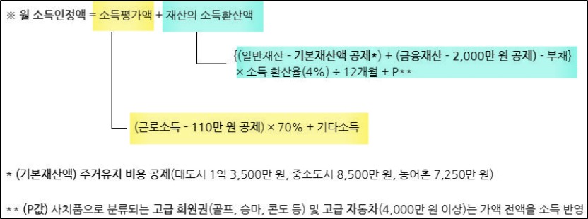 참고로, 소득인정액은 소득평가액 + 재산의 소득환산액으로 산정되며 각 항목마다 공제되는 금액이 있으니 꼭 확인하셔야 합니다!!